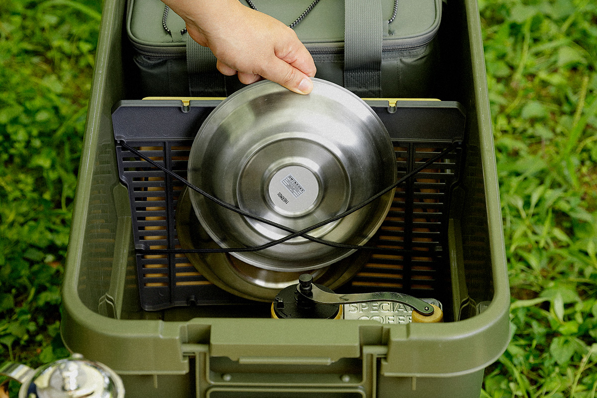 トランクカーゴ 仕切板にはヒモやバンジーコードなどを通せる溝がついています。棒状のものや、まな板や平皿などの道具を仕切板と括ることで固定・収納することができます。