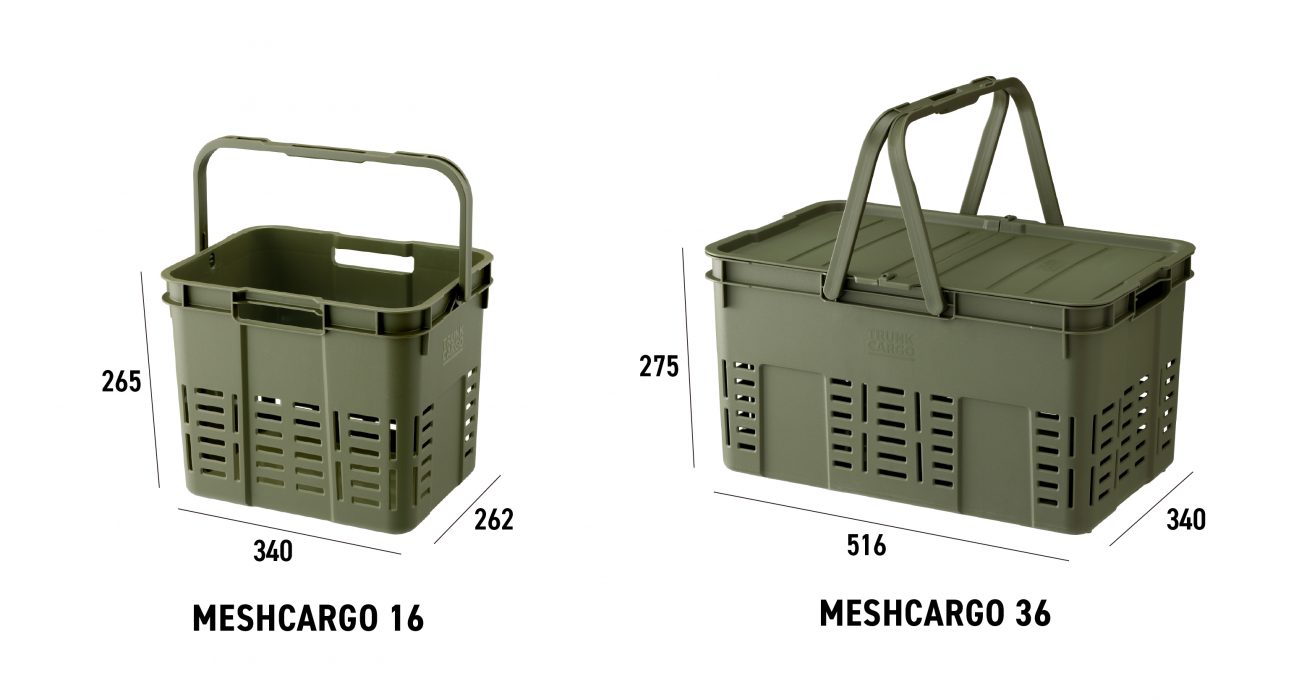 今回新たに登場したメッシュカーゴ36は、従来サイズのメッシュカーゴ16を上回る36Lサイズと大幅にサイズアップ。キャンプやアウトドアのみならず、これまで以上に様々な場所やシーンで活躍することが期待できる製品となっております。